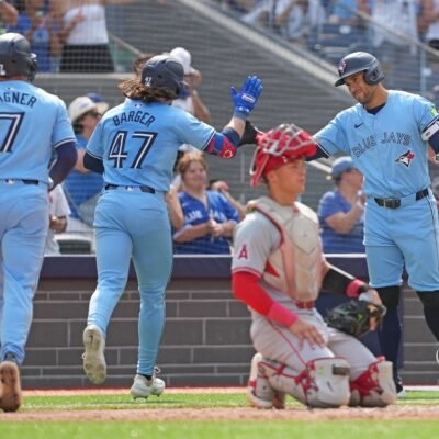 Aug 25, 2024; Toronto, Ontario, CAN; Toronto Blue Jays right fielder Addison Barger (47) hits a two run home run and celebrates with designated hitter