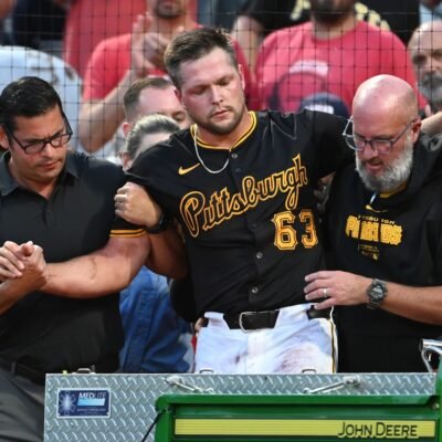 Aug 24, 2024; Pittsburgh, Pennsylvania, USA; Pittsburgh Pirates pitcher Hunter Stratton (63) is helped onto a cart after getting an apparent injured in the fourth