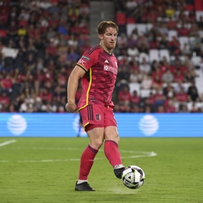 Jul 27, 2024; St. Louis, Missouri, USA; St. Louis CITY SC defender Tim Parker (26) makes a pass against FC Dallas in the second half