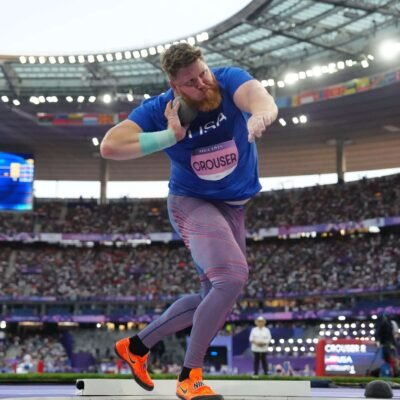 Aug 2, 2024; Paris, FRANCE; Ryan Crouser (USA) in the men’s shot put qualifications during the Paris 2024 Olympic Summer Games at Stade de France.
