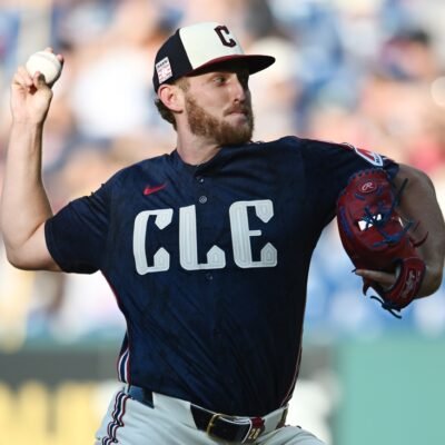 Jul 19, 2024; Cleveland, Ohio, USA; Cleveland Guardians starting pitcher Tanner Bibee (28) throws a pitch during the first inning against the San Diego Padres
