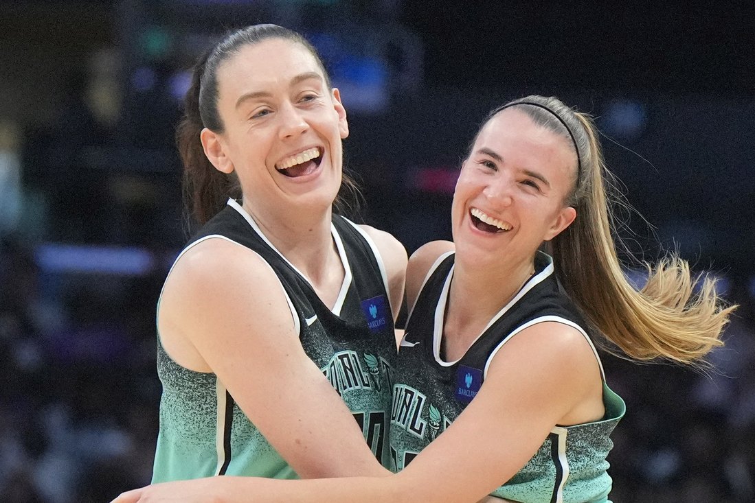 Aug 15, 2024; Los Angeles, California, USA; New York Liberty forward Breanna Stewart (30) and guard Sabrina Ionescu (20) celebrate in the first half against the LA Sparks Crypto.com Arena. Mandatory Credit: Kirby Lee-USA TODAY Sports The New York Liberty became the WNBA’s first team this season to clinch a playoff spot following their win on Saturday at the Las Vegas Aces.