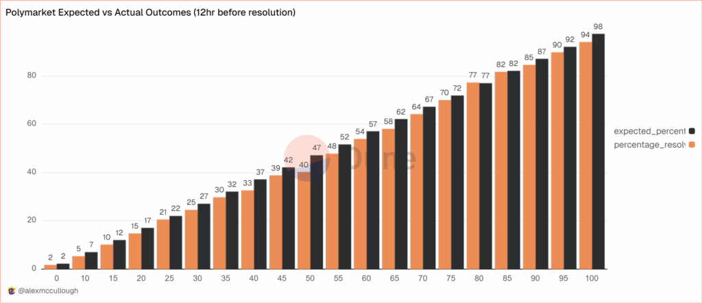 Across some 90,000 predictions the Polymarket Brier Score for a 12 hour ahead prediction is .0581. As Alex notes: