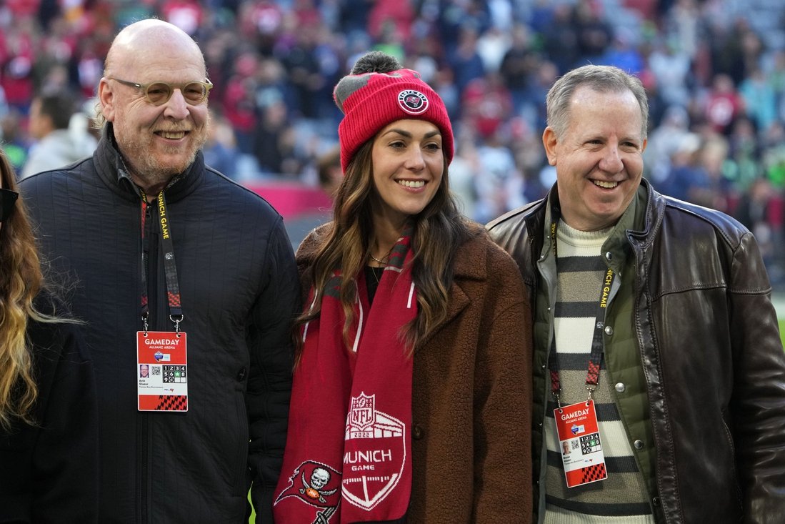 Nov 13, 2022; Munich, Germany; Tampa Bay Buccaneers owners Avrum Avie Glazier (left), Darcie Glazer Kassewitz (center) and Bryan Glazer (right) pose during an NFL International Series game against the Seattle Seahawks at Allianz Arena. Mandatory Credit: Kirby Lee-USA TODAY Sports Tom Brady may no longer play for the Tampa Bay Buccaneers, but the superstar quarterback’s retirement a year ago apparently isn’t hurting the team’s value.
