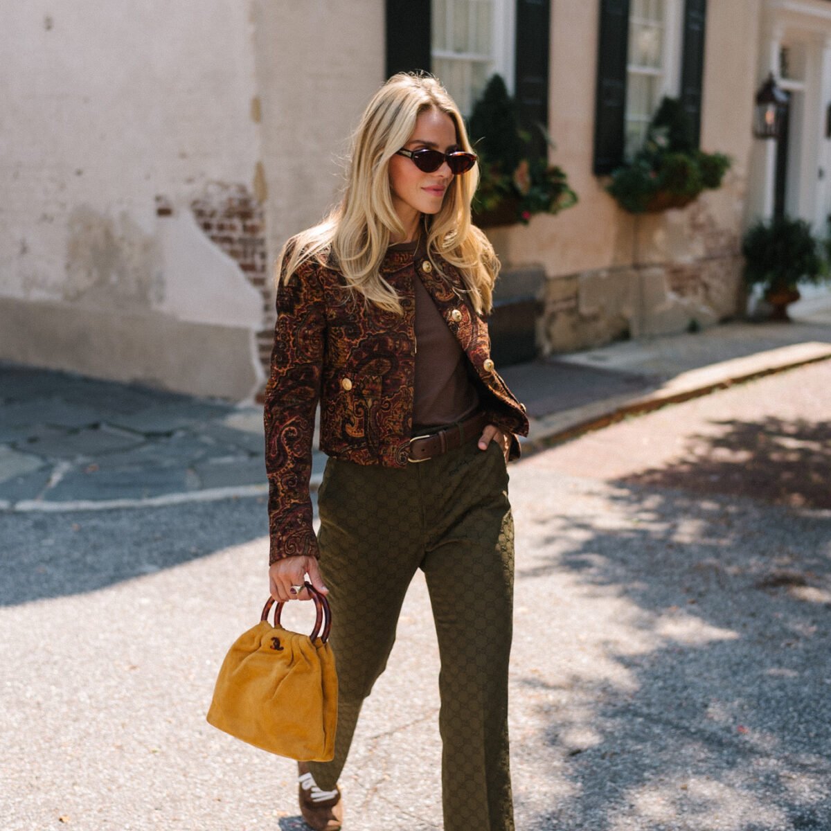 Chloe Jacket, Rue Sophie Tank, Gucci Pants, Prada Sneakers (similar, less expensive here), Vintage Chanel Bag (similar here and here), Fope Necklace, Similar Belt, Jacque Marie Mage Sunglasses