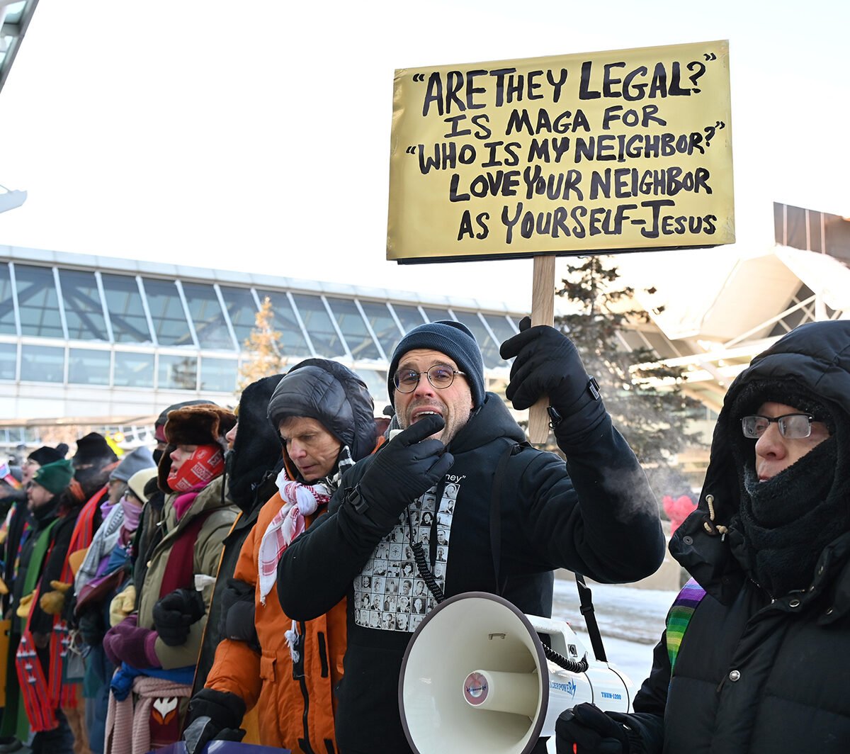 Within that larger strike, our faith convergence took part in actions of defiance organized by MARCH. At Minneapolis-St. Paul International Airport, some 100 clergy were arrested, while an estimated 600 local community members and out-of-town clergy stood witness. Later, I joined a group of multifaith clergy in song, prayer and presence at the B.H. Whipple Federal Building, where Minnesota’s ICE offices are headquartered. More a sprawling compound than a single building, it was an ugly, stomach-turning place: streams of protesters, anti-ICE graffiti and the heavy feeling of power concentrated behind concrete walls.