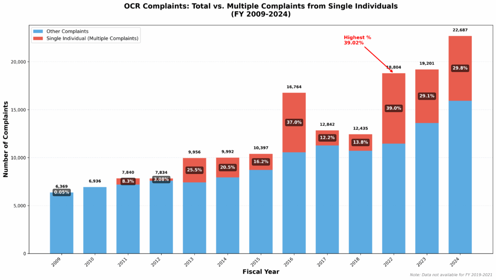 In the annual reports for 2022-2024 the OCR identifies what type of complaint the single-individual with multiple complaints was making, a sex discrimination complaint, while in previous years they just give data on the number of complaints from single individuals compared to the total of all types of complaints. I’ve collated this data in this graph which presents totals compared to multiple complaints from a single individual without regard to the type of complaint. Do note, that there are also single individuals filing hundreds of other types of complaints such as age discrimination complaints so the data from more recent years may actually be an underestimate.