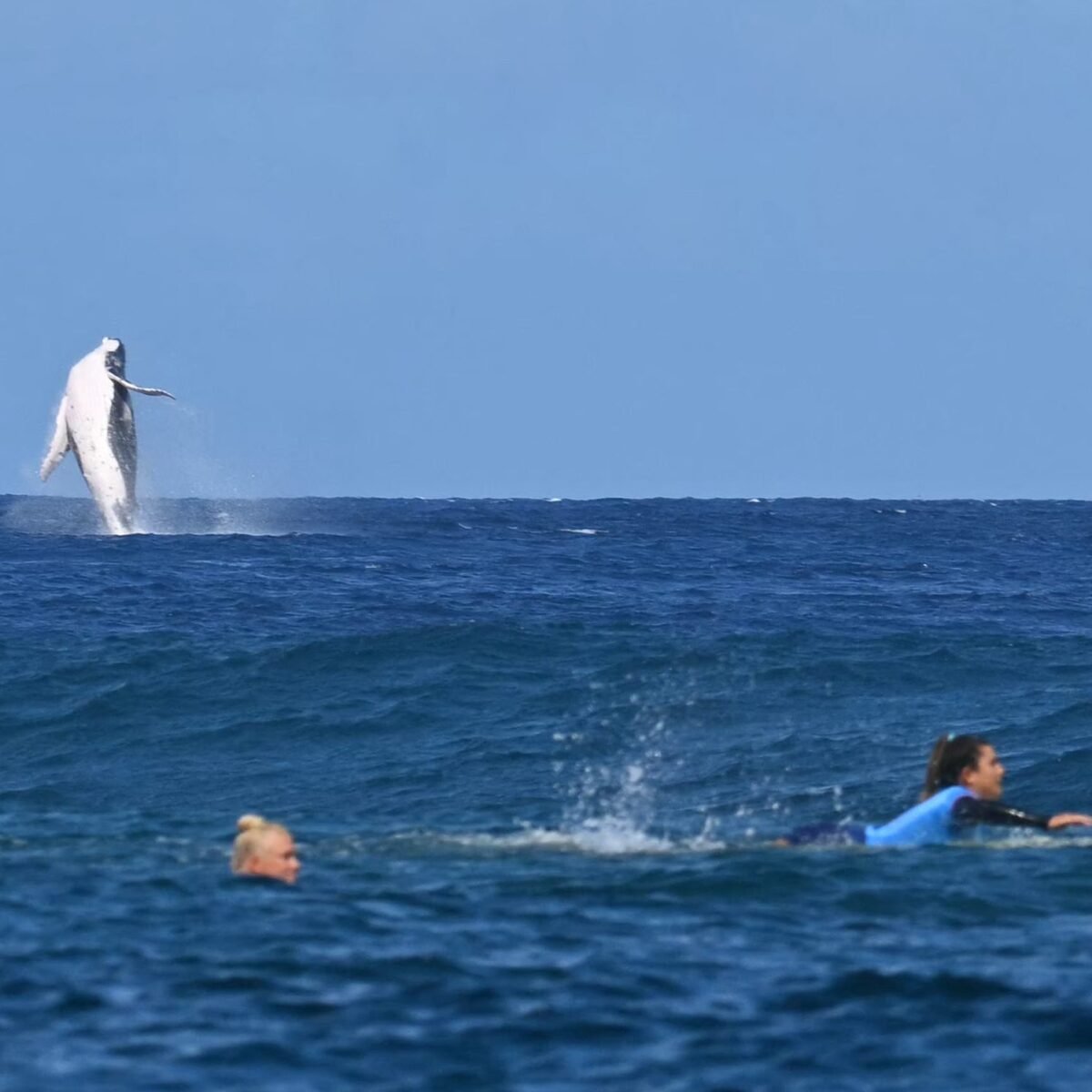 On August 5, while Brazilian athlete Weston-Webb and Costa Rican athlete Hennessy competed in a women’s semifinal surfing match at the French Polynesian island of Tahiti, a whale breached in the distance, providing a picture-perfect sight.